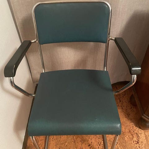 Vihreä ja punainen Hetekan putkituoli. Molemmissa pientä iän tuomaa kulumaa. Punaisessa tuolissa verhoilu on hyvässä kunnossa. Vihreässä tuolissa on istuinosassa tahra, jonka voisi mahdollisesti korjata esim. vinyylimaalilla. Molemmissa on hyvä istua ja tuolit ovat tukevat.