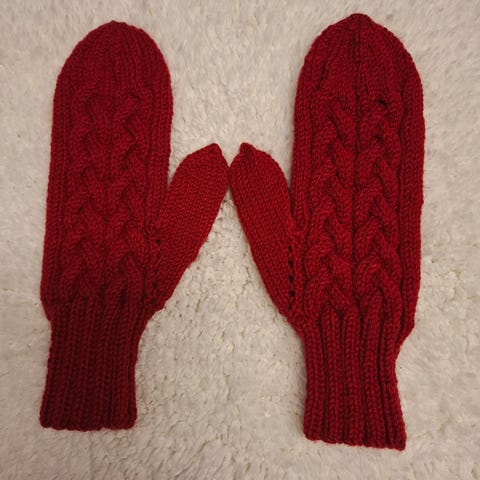 Palmikko lapaset 7-veljestä langasta väri Marja puuro. Lasten/nuorten koko, pituus 21.5cm ja leveys 8cm