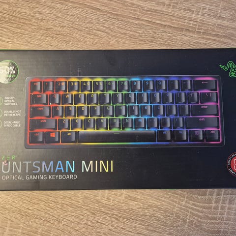 Razer Huntsman Mini näppäimistö, mekaaninen, 60% koko, RGB-valaistus. Sopii pelaamiseen ja tehokkaaseen näppäimistön käyttöön, tarjoaa kompakti muotoilu ja optiset kytkimet.