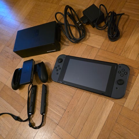 Nintendo Switch v2 pelikonsoli sisältää 2x Neon siniset ja punaiset Joy-Con ohjaimet. Mukana tulee neljä peliä: Mario Party, Mario Odyssey, Mario Kart 8 Deluxe ja Super Mario 3D World + Bowser's Fury. Pakettiin kuuluu myös konsolin telakka, ohjainten lisävarusteet sekä kantokotelo.