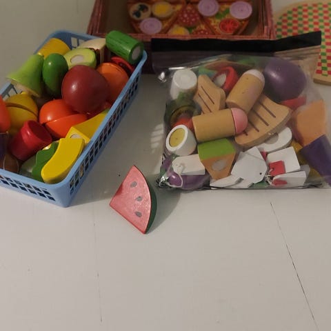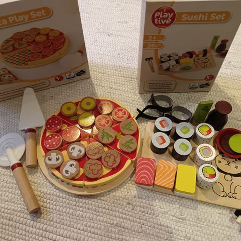 Kuvassa oleva setti puisia ruokia ja keittiötarvikkeita. Mukava myös leikattavia ruokia ja huopakankainen pizza. Pientä käytön jälkeä löytyy ja yhden kattilankannen kahva kääntynyt hieman. Olleet yhden lapsen leikeissä.