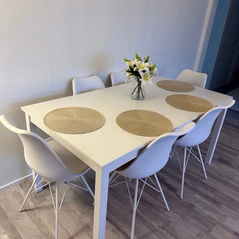 Nahkaverhoilu on elävä ja luonnollinen, nahkapinnoissa on käytönjälkeä, kulumaa ja naarmuja - etenkin pöytäpinnassa, mikä kyllä tietyllä tavalla sopii kaluston hieman rouheaan tyyliin. Ryhmä on tukeva ja metallirungon vuoksi myös melko painava. Neliön mallisen pöytälevyn koko on 76,5 x 76,5 cm.