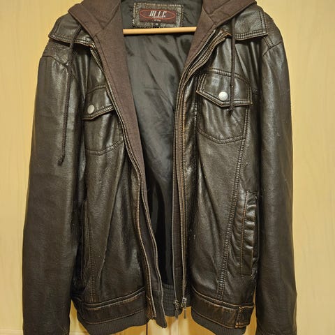 Painava takki. Vetoketju toimii, nahka tarvitsee huoltoa. Toisen taskun vetoketju rikki(kuva).