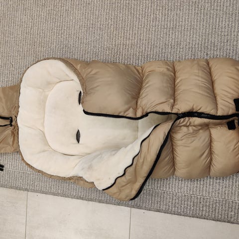 Myydään turvakaukalon makuupussi 0-12m, takana teippi irronnut yhdestä kohtaa.