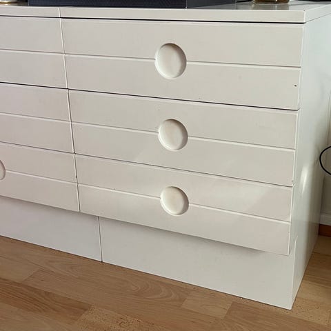Tukeva ja ikäisekseen hyvässä kunnossa, paitsi alin hylly, kuten kuvasta näkyy korvattu valkoisella levyllä
