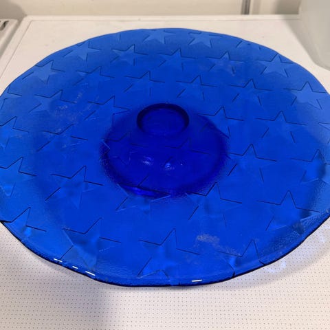 Myydään tyylikäs tähtikuvioitu sininen Villeroy & Bochin kakkulautanen. Halkaisija 38cm.