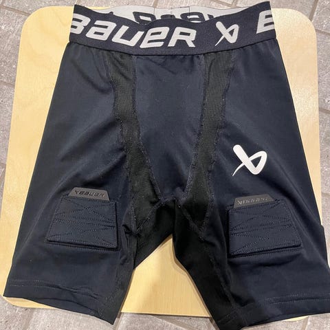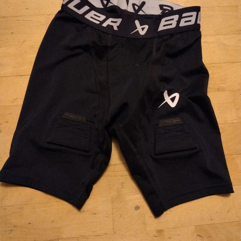 Bauer alasuojashortsit. Koko lappu puuttuu mutta ollut 12-13 vuotiaalla ja 152 cm. Bauer Teksti osittain kulunut pois, muuten ehjät ja puhtaat. Tarranauhat kunnossa.