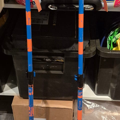 Myydään tarpeettomana vanhahko mutta käyttökelpoisia sukset ja sauvat pienimmälle. Sauvojen pituus on 80cm.