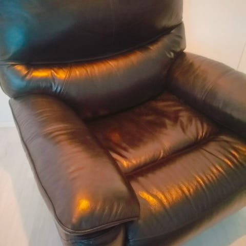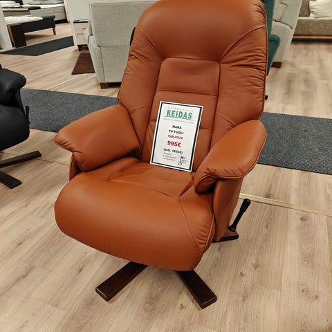 Kaksi nahkaista Ruby tv-tuolia sisään vedettävällä jalkatuella, akku- ja verkkovirralla. Niskatuen säädöllä, sivupöydällä ja lepoasentoon säädöllä.