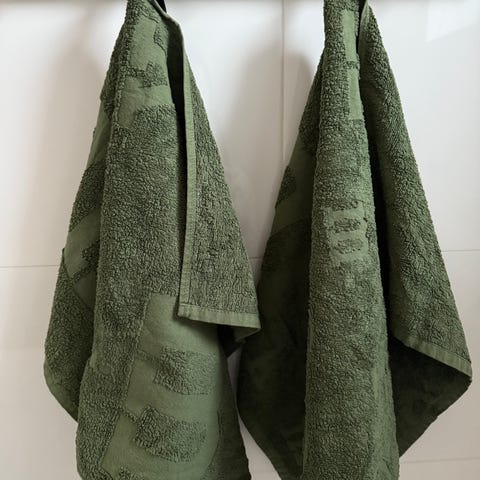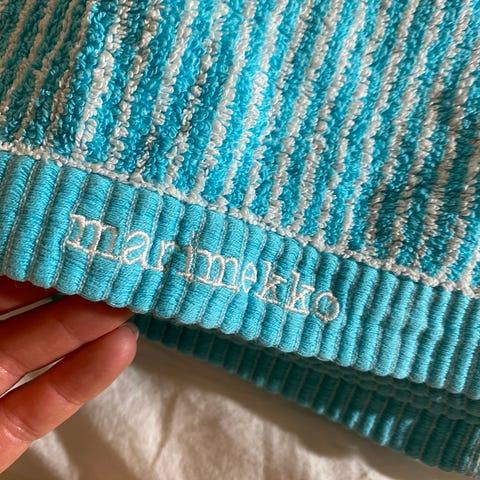 Marimekko käsipyyhe, jossa on beige ja valkoinen kuviollinen design