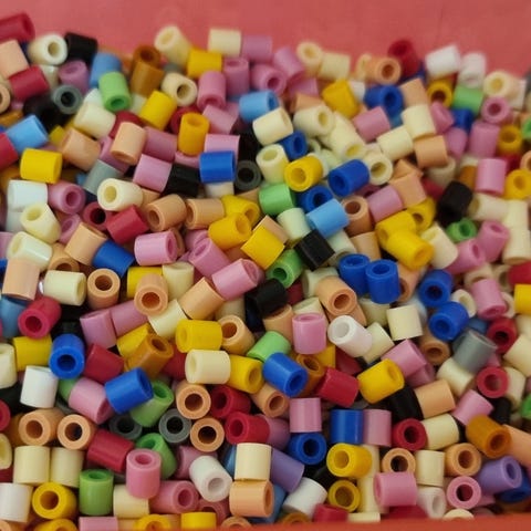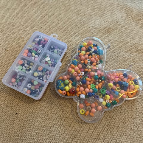 Helmiä ja kaksi lankarullaa läpinökyvässä rasiassa. Hyväkuntoinen.