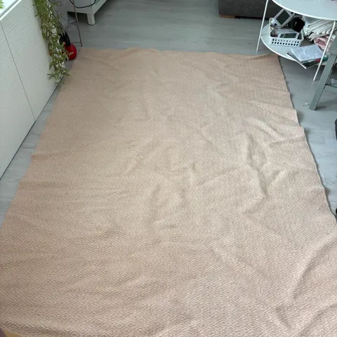 Myytävänä kunnoltaan virheetön raitakuvioinen matto. Materiaali 100% villaa. Valkeat raidat ovat lämpimänvalkoisia, vrt. kuvan reunassa näkyvään kirkkaanvalkoiseen kalusteeseen.