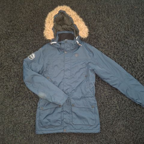 Kaikin puolin ehjä talvitakki. Hihasuissa paikoitellen hienoisia kulumajälkiä.