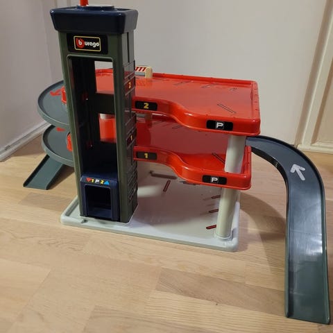 Pikkuautojen parkkitalo, jossa useita kerroksia ja kiertävät ramppiradat. Sisältää pysäköintialueet, hissin ja huoltopisteen. Rataa pitkin saa pikkuautoilla otettua vauhdikkaita kisoja.