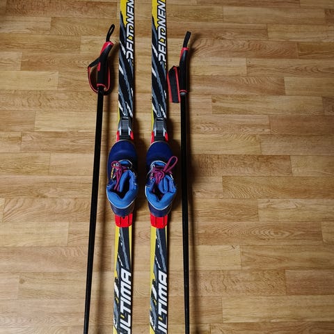 Myydään hyväkuntoinen Peltonen pitopohja suksipaketti lapselle perinteiseen hiihtoon. Päiväkoti hiihto. Ei tarvitse voidella, voiteluvapaa.