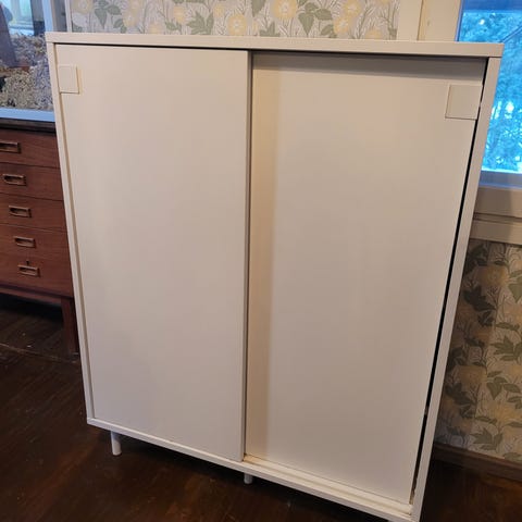 Matala valkoinen Ikean mackapär kaappi liukuovilla. Hyvä käytetty kunto. Toisesta hyllylevystä puuttuu 2kpl kannakkeita (kt kuva). Muutossa tullut edestäkatsottuna oikealle puolelle päätyyn muutamia naarmuja. Kannessa pientä elämisen jälkeä. Kuvat naarmuista yms.