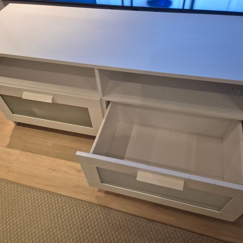 Tyylikäs, erittäin siisti Ikean valkoinen TV-taso, jossa kaksi hyllyä ja kaksi lasisella etulevyllä varustettua laatikkoa. Laatikoissa irralliset muoviset pohjalevyt, joita voi käyttää laatikon pohjan suojana tai vaihtoehtoisesti DVD-levyjen säilytykseen.