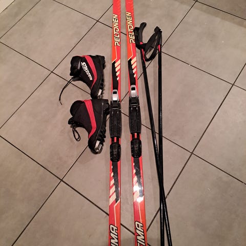 Uudenveroinen suksisetti. Peltosen sukset 150cm, Apollo-sauvat noin 113cm ja Alpina-monot koko 38. Maksimissaan kolme kertaa hiihdetty eli uudenveroiset. Hinta 100€ koko setille.