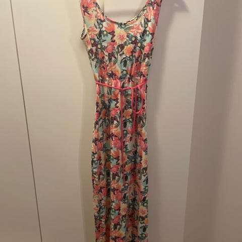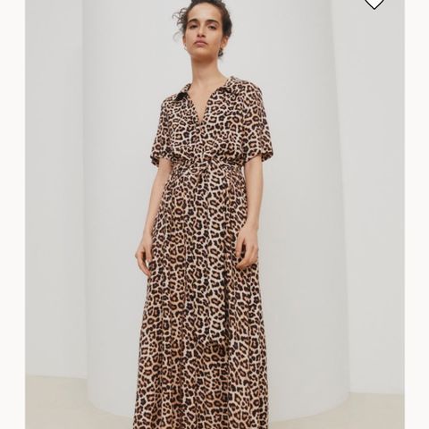 Leopardikuvioinen A-linjainen mekko on lähes käyttämätön. Edessä piilonapitus, mukana vyö, kangas on kauniisti laskeutuvaa viskoosia. Kai-kai 52 cm, pituus 138 cm.