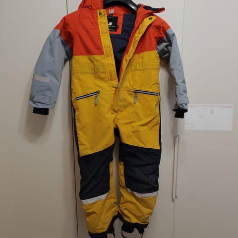 Didriksonin talvihaalari 110/116 cm. Polvissa ja pepun kohdalla vähän karheumaa. Nappilista edestä on rikkoontunut "mahalaskuista", mutta nepparit paikallaan ja ehjät. Muuten täysin ehjä haalari esim. Kakkoshaalariksi.