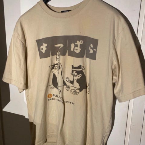 Myydään vähänkäytetty kissa -t-paita kokoa S. Hinta 2 euroa.