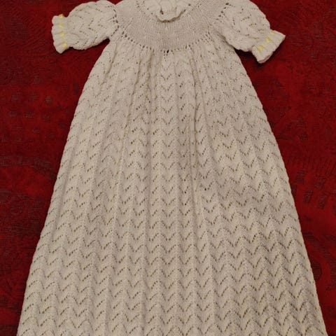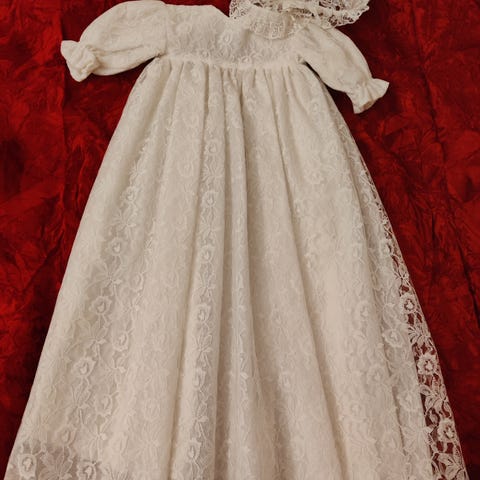 Kerran käytetty ja pesty käsin ommeltu kastemekko. Selässä nepparikiinnitys ja etupuolen rusetti myös nepparilla kiinni eli voi vaihtaa haluttaessa.