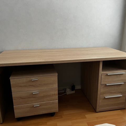Hyväkuntoinen, jykevä puinen kirjoituspöytä. Kolme tilavaa laatikkoa.
