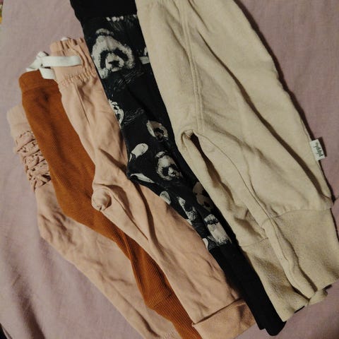 4kpl housuja, koko merkinnät 62-68, kaikki vastaa enemmän kokoa 62. Käytettyjä, mutta ehjiä.