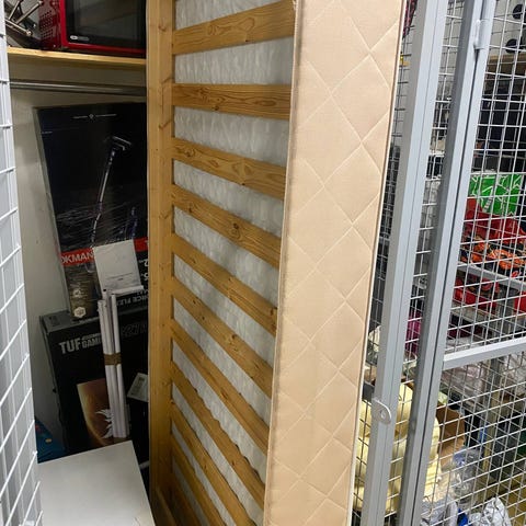 Jämäkässä ja siistissä kunnossa oleva sänky petauspatjalla. Sängyssä on noin 20 cm korkeat puiset jalat, joten lattian puhdistus onnistuu helposti sen alta.