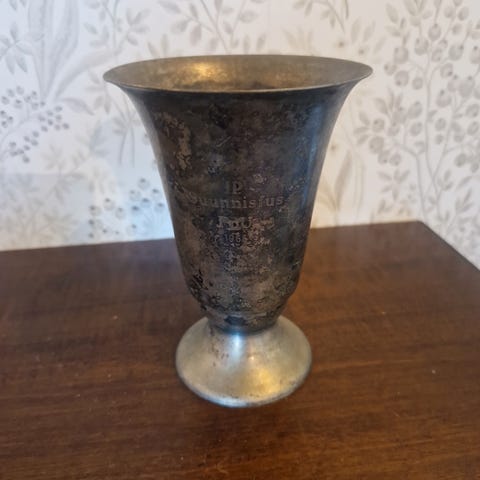Kuvassa näkyvä vuodelta 1956 oleva kannellinen palkintopokaali, jossa kuvassa näkyvä ympyräinen kuva ja teksti. Kannessa kotka siivet levällään ja pokaalin korkeus 31 cm. Kuvassa karhu, jousiampuja sekä teksti: Bogens Skytt Eforening ja vuosi 1956.