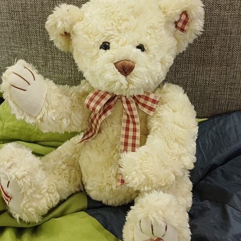Ihanan pastellipinkki nalle jonka sisällä helisee helmet. Vaaleanpunainen rusetti. Sisäkorvat ja tassut satiinia. Tarpeettomana.