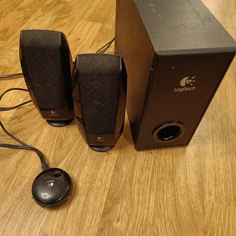 Mukana kaksi kaiutinta ja subwoofer. AUX-liitännällä kiinni tietokoneeseen, kännykkään tai muuhun äänilähteeseen.