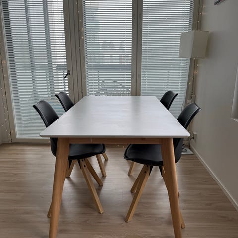Myydään valkoinen korkea ruokapöytä ja kaksi pöytään kuuluvaa tuolia. Pöydän pinnassa jälkiä (kuva), mutta yleiskunto on siisti.