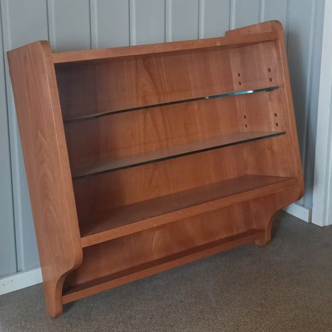 Kuvien mukainen teakkinen seinähylly ja kiinnikkeet. Toisella puolella näkyy pari vaaleampaa kohtaa. Hyllyssä ei ole ruuvin reikiä.