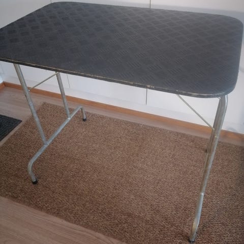 Trimmauspöytä, jossa musta pöytälevy ja taitettava metallinen jalusta. Helppo säilyttää ja kuljettaa taitettavan rakenteen ansiosta.