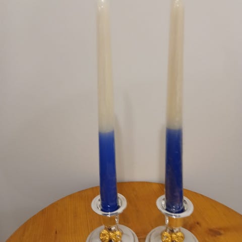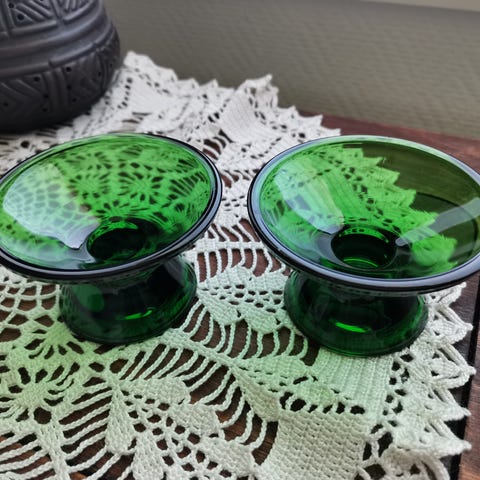 Kuin uudet, kauniit syvän vihreät kynttilänjalat, tarrat paikoillaan.