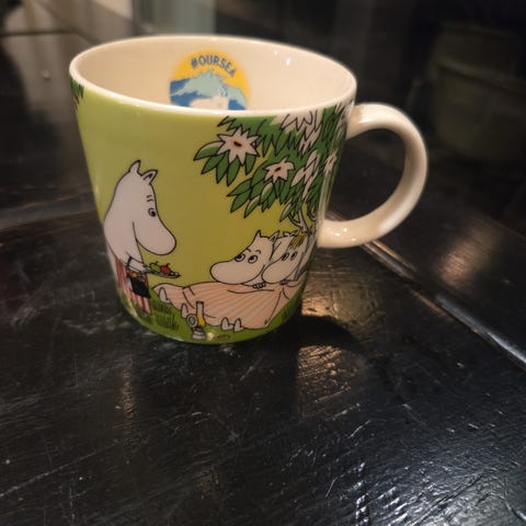 Uudenveroinen, mutta käytetty muumimuki - Loikoilua. Ei tarraa.