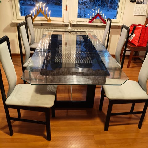 Näyttävän dramaattinen huonekalu. Kromattu raskas metallirunko ja kirkas lasilevy. Sopii työpöydäksi tai ruokapöydäksi. Vähäistä kulumaa/naarmuuntumista.