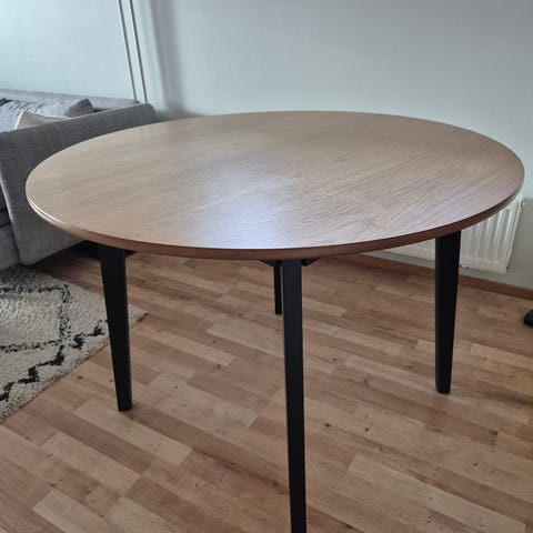 Ruokapöytä, ostettu keväällä 2025 uutena. Nyt myyn pois muuton alta. Pöytä on muuten erittäin hyvässä kunnossa, mutta jalassa on yksi naarmu (näkyy kuvassa). Väriltään tummanruskea ja materiaali on puu. Ovh 349,99€. Pöytä on tukeva ja painava. Pohjan halkaisija on 45cm. Pöydän reunan ja helman välinen etäisyys on 30cm. Pöytä on muuten halkaisijaltaan 110cm. Kissatalous. Nouto Nokialta.