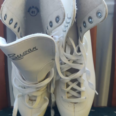 Vanhat mutta hyvin toimivat luistimet.Pinnassa on kulumaa kuten kuvasta huomaa mutta se ei käyttöä haittaa:)! Koko 38-39 ,paikan päällä sovitus mahdollista.Vain haku Palokasta.