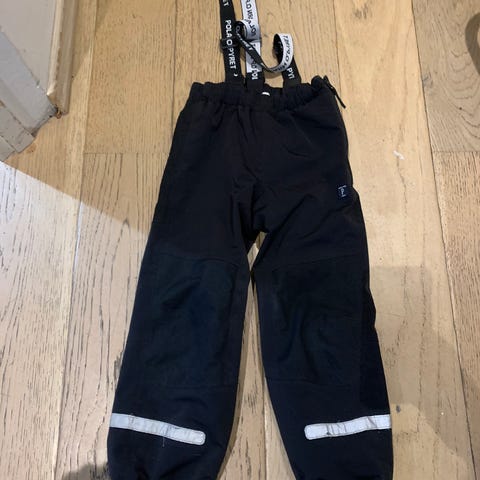 Mustat perus ulkohousut. Toisessa polvessa pieni reikä (kuva). Kenkäremmlt ehjät, mutta kuluneet.