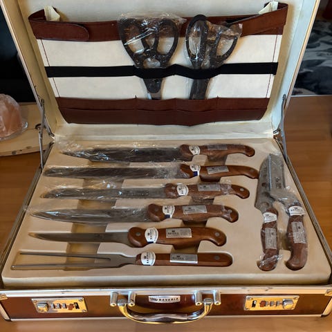 Kuvien mukaan Bavaria Ottingher Exclusive kokkiveitsi sarja laukussa. Sisältää 9 osaa: 7 erilaisia keittiöveitsiä, teroitinpuikko ja haarukka. Materiaali ruostumaton teräs, KÄYTTÄMÄTÖN. Nouto, postitus tai kulkeutuu omien menojen mukaan PK-seudulle.