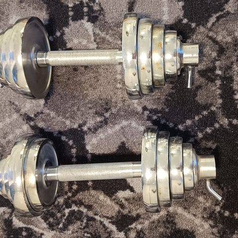 Yorkin säädettävät käsipainot, mukana 4x1,25 kg levyt ja 4x2,5 kg levyt. Helppo pyöritettävä mekanismi. Hyvässä kunnossa, ei juuri käytetty vaan pyörineet nurkissa. Vain nouto tai erikseen sovittuna toimitus, jos sattuu matkan varrelle.