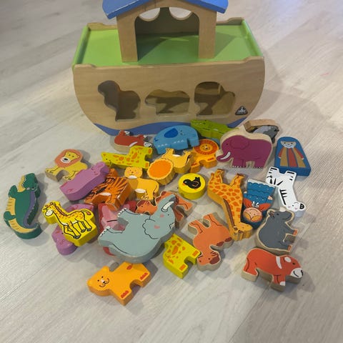 Myynnissä hape merkkinen perässä vedettävä puinen Nooan arkki lelu, johon kuuluu laiva, irrotettava katto sekä kuvassa näkyvät puiset eläimet. Laivan sisäpuolella tarra, jota en äkkiseltään saanut irrotettua.