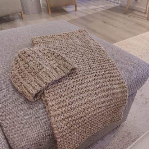 Pipo joista tulee hihat, hihoissa myös peukaloille aukot. Hihat voidaan käyttää myös kaulaliinana. Tuotteessa ei ole lappuja tai tuotetietoja. Ei käytetty saatu lahjaksi.