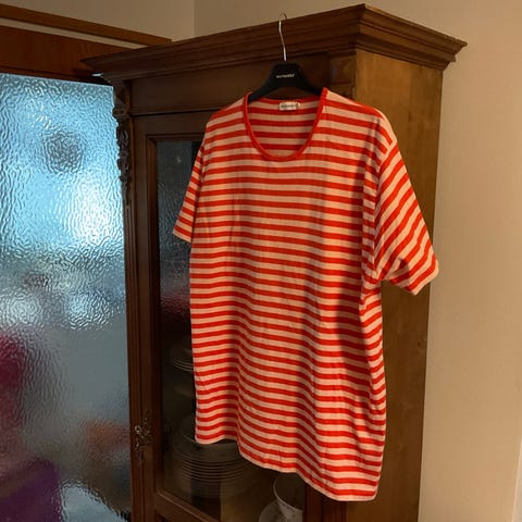 Myydään Marimekon t-paita. Väri punainen/luonnonvalkoinen. Koko on XXL. Kainalo-kainalo-mitta on noin 67 cm ja olka-helma-pituus on noin 75 cm.