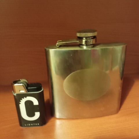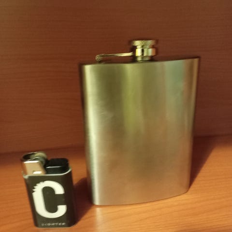 Kuvan käyttämätön taskumatti ruostumatonta terästä. Koko : kork. Korkin kohdalta 10cm ja lev. 9,5cm.
