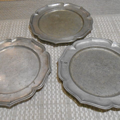 Vintage tinalautaset 4 kpl (Apilanlehti malli). Yhden pinnassa hieman karheaa, voi lähteä poiskin jollain käsittelyllä. Lautasten halkaisija 17,5 cm. Kaikkien hinta yhteensä 8 euroa.