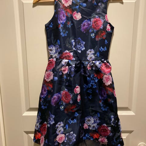 Mittoja : olka-helma pituus:78 cm, hiha kai-hihansuu:42 cm. Hartialeveys olkasaumoista:37 cm, näiden perusteella valitsin valokosta 146 ( varmaan 146-154), mekkon merkitty 10. Malli väljä, joten vyötäröä en mittaa.