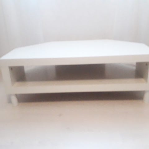 Ikean vittsjö tv-taso lasisella välihyllyllä. Kanneksi mukaan kuvan puinen taso, joka hieman hyllyä syvempi ja leveämpi. Kansi ollut kiinnitettynä ruuveilla runkoon. Runko on teipattu mattamustaksi, teipin alla pinta on valkoinen.